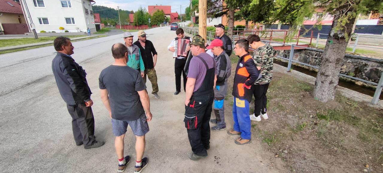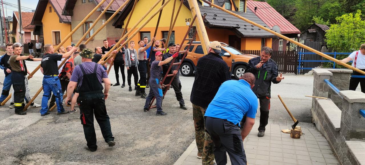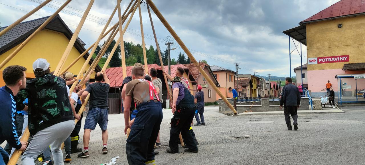 Dobrovoľníci a členovia obecných zložiek - FS Vikartovčan, DHZ Vikartovce a OFK Vikartovce za neodmysliteľnej asistencie p. Dávida Lavka sa postarali o bezproblémové osadenie pripravených májov.
